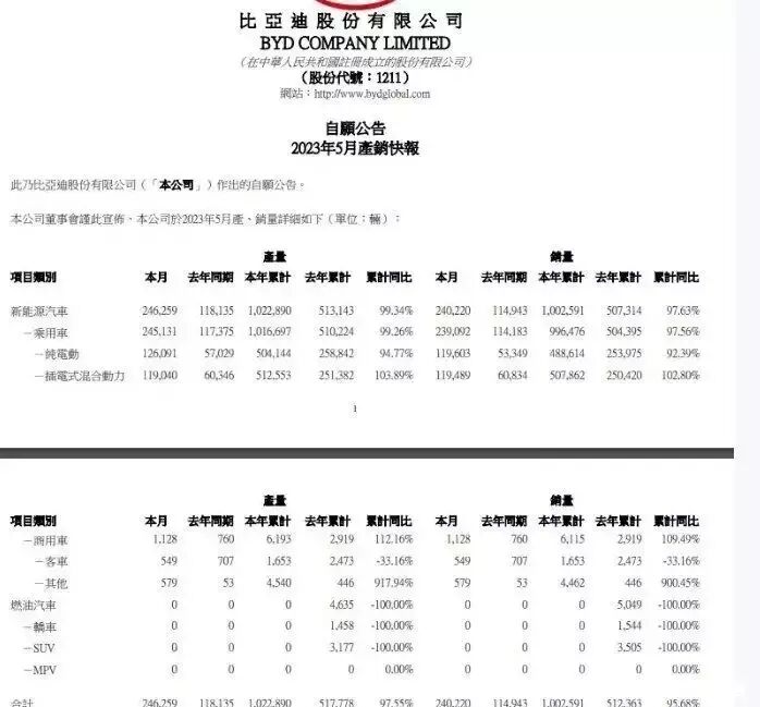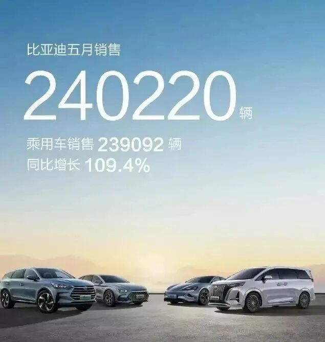 比亞迪控股6月1日公布的銷量數據顯示,今年5月份比亞迪控股汽車銷量達到240,220輛,其中乘用車銷量239,092輛,同比109.4%。據悉,比亞迪汽車(王朝和海洋網)5月銷量228,087輛,同比增長99.8%。憑借這樣的數據銷量,比亞迪毫無懸念再度霸榜。老實說,比亞迪霸榜這件事本身沒有任何懸念,有懸念的隻是具體的數據能達到多少。但是24萬台這個數字擺上台麵的時候,還是讓人驚歎,對於比亞迪而言,2022的開始仿佛是紫微星降臨一樣,銷量大漲股票也跟著翻翻,更是在2023年的上半年一直開了個好頭。