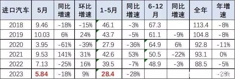 今年以來,這一數據仍在持續下滑,相對於過去十年的進口量低點仍有下降。6月26日,乘聯會發布的數據顯示,2023年5月,中國汽車進口量為5.84萬輛,同比下跌18%;今年1-5月進口車數量僅有28萬輛,同比下跌28%。按前五個月月均6萬輛的銷量來算,預計今年全年的進口車銷量僅有70萬輛左右。