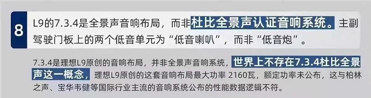7.3.4是理想L9原創的音響布局,並非全景聲音響係統,世界上不存在7.3.4杜比全景聲這一概念,理想L9原創的這套音響布局最大功率2160瓦,額定功率未公布,這與柏林之聲、寶華韋健等國際行業主流的音響係統公布的性能數據邏輯不符。