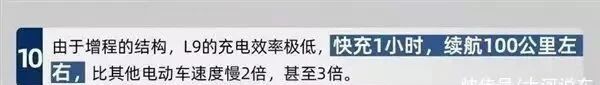 網傳:由於增程的結構,L9的充電效率極低,快充1小時,續航100公裏左右,比其他電動車速度慢2倍,甚至3倍。