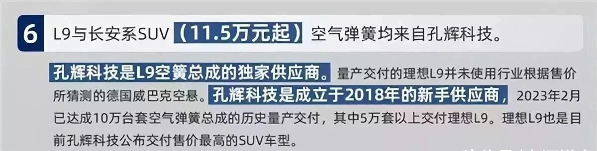 網傳:L9與長安係SUV (11.5萬元起)空氣彈簧均來自孔輝科技,孔輝科技是L9空簧總成的獨家供應商。量產交付的理想L9並未使用行業根據售價所猜測的德國威巴克空懸。孔輝科技是成立於2018年的新手供應商,2023年2月已達成10萬台套空氣彈簧總成的曆史量產交付,其中5萬套以上交付理想L9,理想L9也是目前孔輝科技公布交付售價最高的SUV車型。