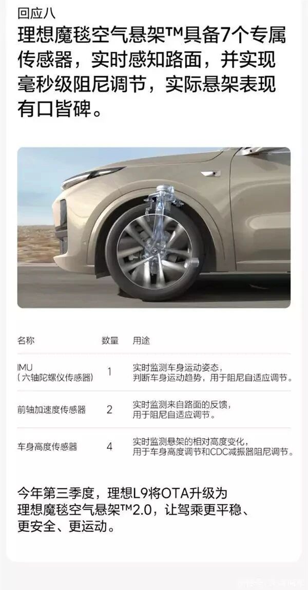 回應:理想魔毯空氣懸架TM具備7個專屬傳感器,實時感知路麵,並實現毫秒級阻尼調節,實際懸架表現有口皆碑。今年第三季度,理想L9將OTA升級為理想魔毯空氣懸架TM2.0,讓駕乘更平穩、更安全、更運動。
