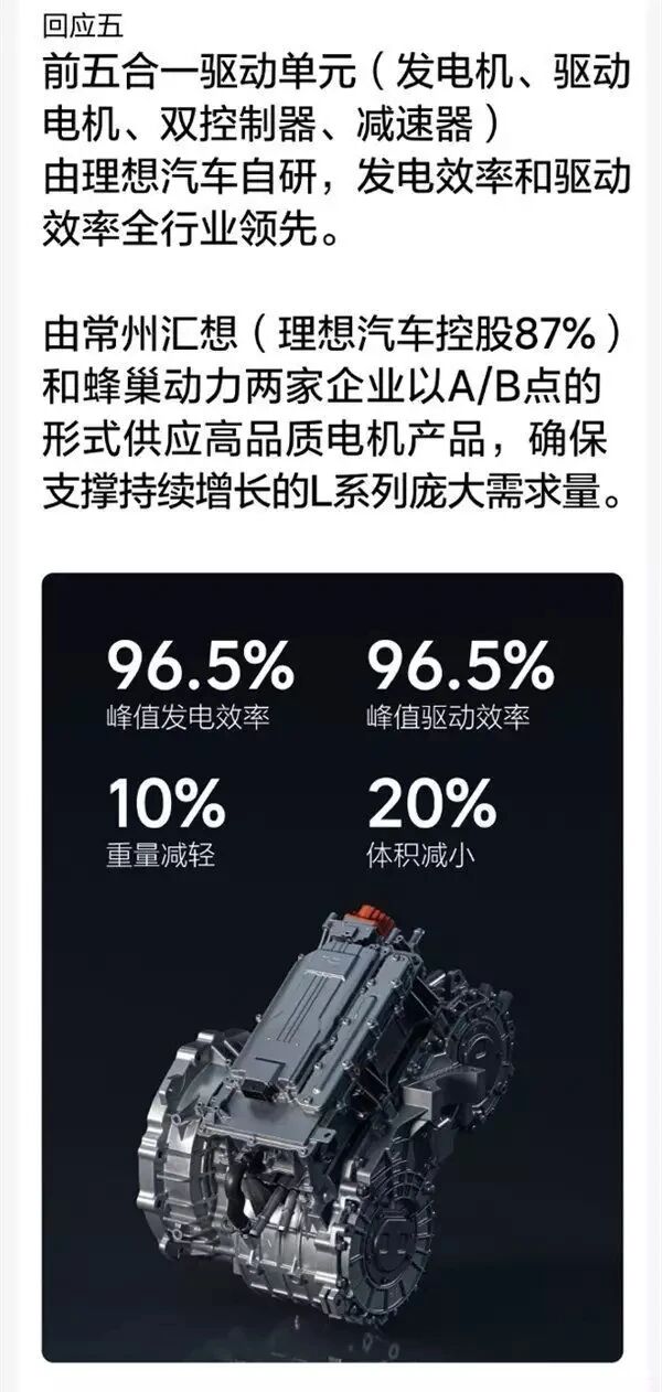 回應:前五合一驅動單元(發電機、驅動電機、雙控製器、減速器)由理想汽車自研,發電效率和驅動效率全行業領先;由常州彙想(理想汽車控股87%)和蜂巢動力兩家企業以A/B點的形式供應高品質電機產品,確保支撐持續增長的L係列龐大需求量。
