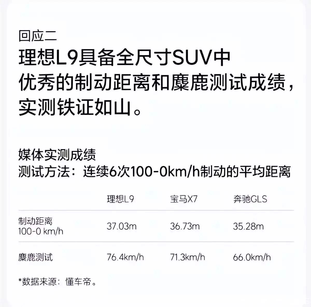 回應:懂車帝實測L9連續6次100-0km/h製動平均距離為37.03m,麋鹿測試為76.4km/h,和寶馬X7、奔馳GLS互有勝負。