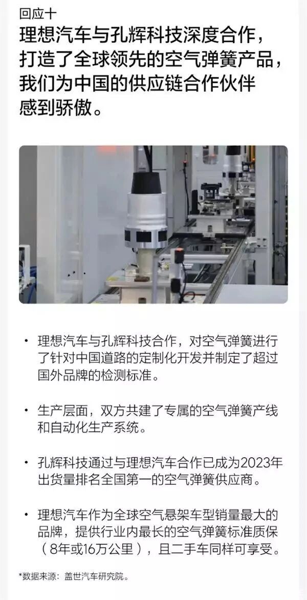 回應:理想汽車與孔輝科技深度合作,打造了全球領先的空氣彈簧產品,我們為中國的供應鏈合作夥伴感到驕傲。