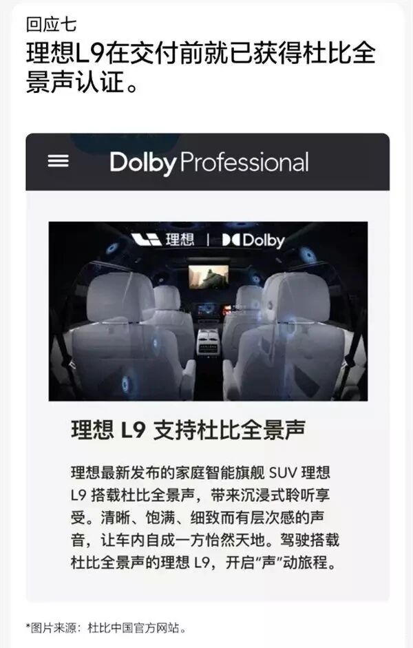 回應:理想L9在交付前就已獲得杜比全景聲認證,7.3.4音響布局貨真價實。