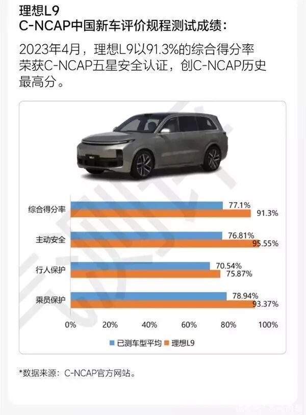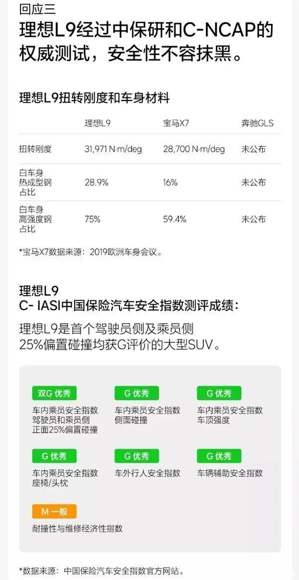 回應:L9經過中保研和C-NCAP權威測試,安全性不容抹黑,車身扭轉剛度31971N·m/deg,成為了中保研首個駕駛員側及乘員側25%偏置碰撞均獲G評價的大型SUV,還成為了C-NCAP曆史最好成績車型。