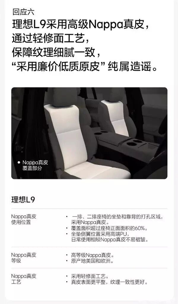 回應:理想L9采用高級Nappa真皮,通過輕修麵工藝,保障紋理細膩一致,“采用廉價低質原皮”純屬造謠。