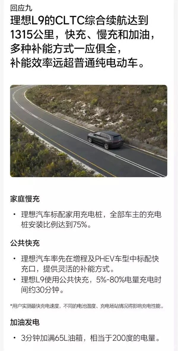 回應:理想L9的CLTC綜合續航達到1315公裏,快充、慢充和加油,多種補能方式一應俱全,補能效率遠超普通純電動車。