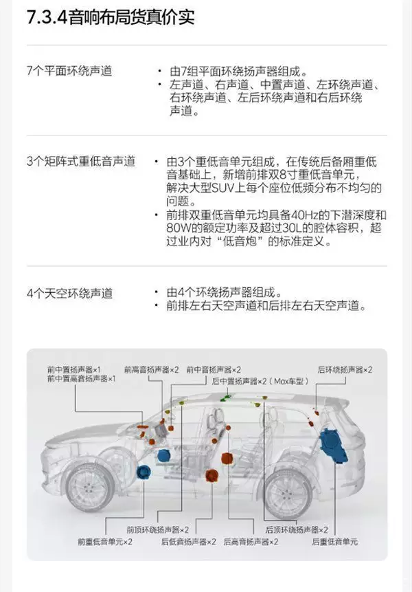 網傳:L9的7.3.4是全景聲音響布局,而非杜比全景聲認證音響係統。主副駕駛門板上的兩個低音單元為“低音喇叭”,而非“低音炮”。