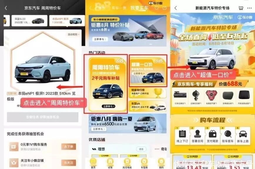 818京東汽車生活節的“周周特價車”“超值一口價”活huo動dong,是shi兩liang家jia在zai新xin車che電dian商shang領ling域yu各ge具ju優you勢shi的de公gong司si首shou次ci進jin行xing深shen度du合he作zuo。在zai此ci次ci合he作zuo中zhong,作zuo為wei全quan國guo第di一yi個ge全quan電dian商shang模mo式shi的de新xin車che交jiao易yi平ping台tai,車che小xiao蜂feng能neng夠gou線xian上shang實shi現xian看kan車che、選車、買車簽約,線下實現快遞到家的門到門服務,發揮了車源供應鏈、汽車專業內容知識庫、銷售服務能力等專業優勢。全國匹配價格最優車源,一台也能享受大客戶批發價;價格透明無捆綁,京東主圖實時更新最優價;一對一3D實景帶看,還可雙屏交互;自營汽車銷售服務團隊,確保服務質量……而京東汽車作為一站式整車選購、車品銷售、養護服務及新能源解決方案平台,則發揮了品牌、流量、交易保障等強大的平台優勢,為活動背書。車小蜂與京東汽車各展其長,讓更多用戶能夠買到又好又便宜的新車。