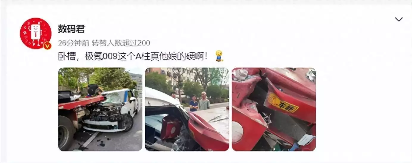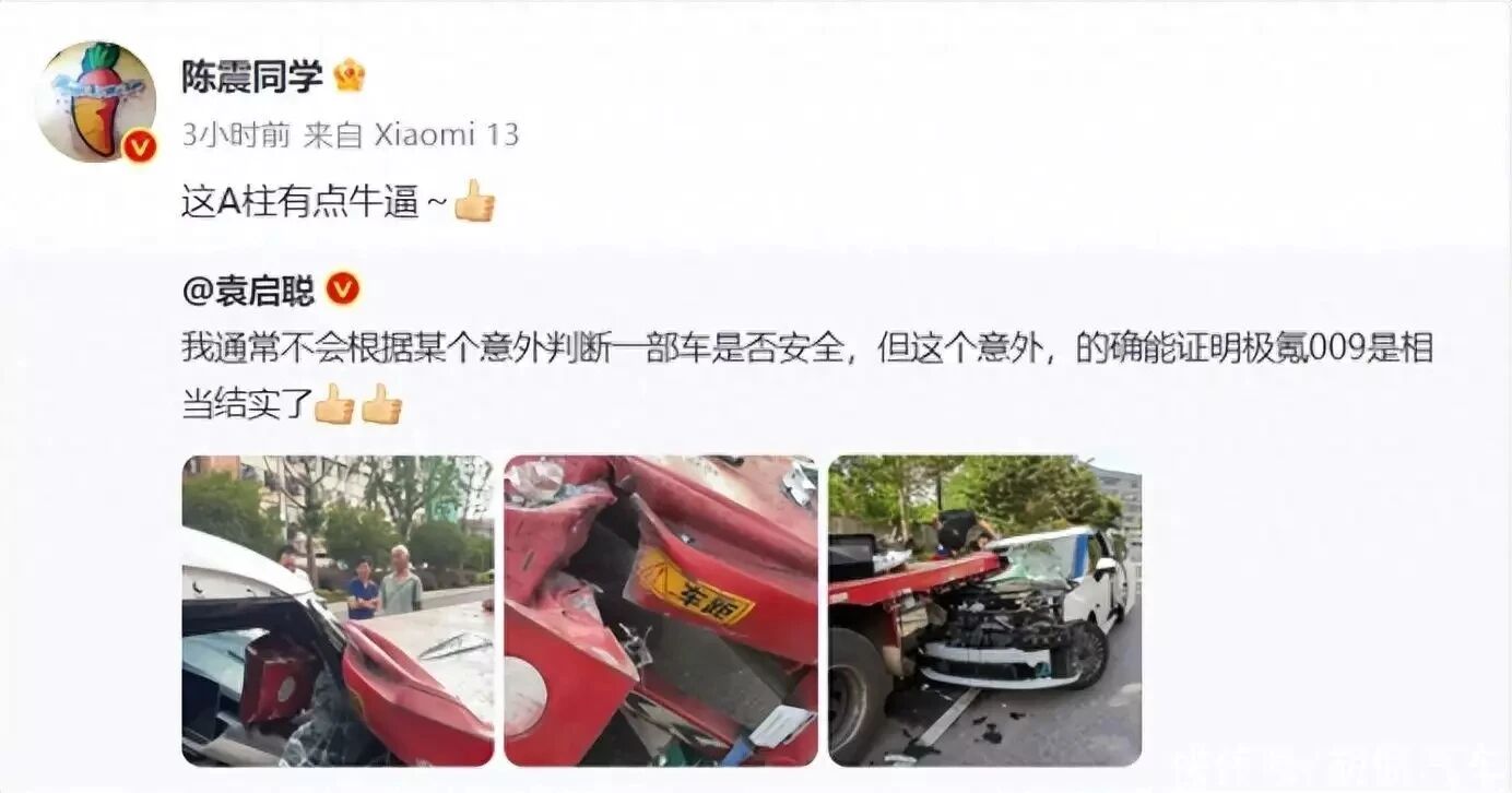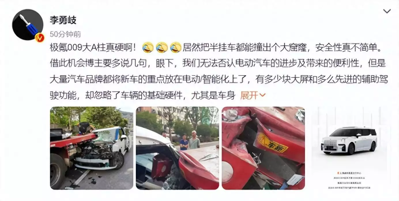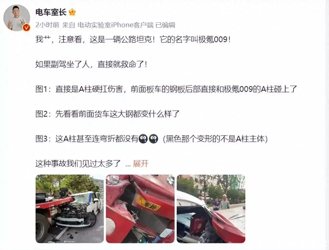 今天有幾張圖片刷爆了汽車圈,陳震同學、袁啟聰等等好多大V都在熱議,表示“極氪009的A柱有點牛”、“居然把半掛車都撞出了一個窟窿”、“把拖車後麵的鋼板平台都給撞割裂了”……