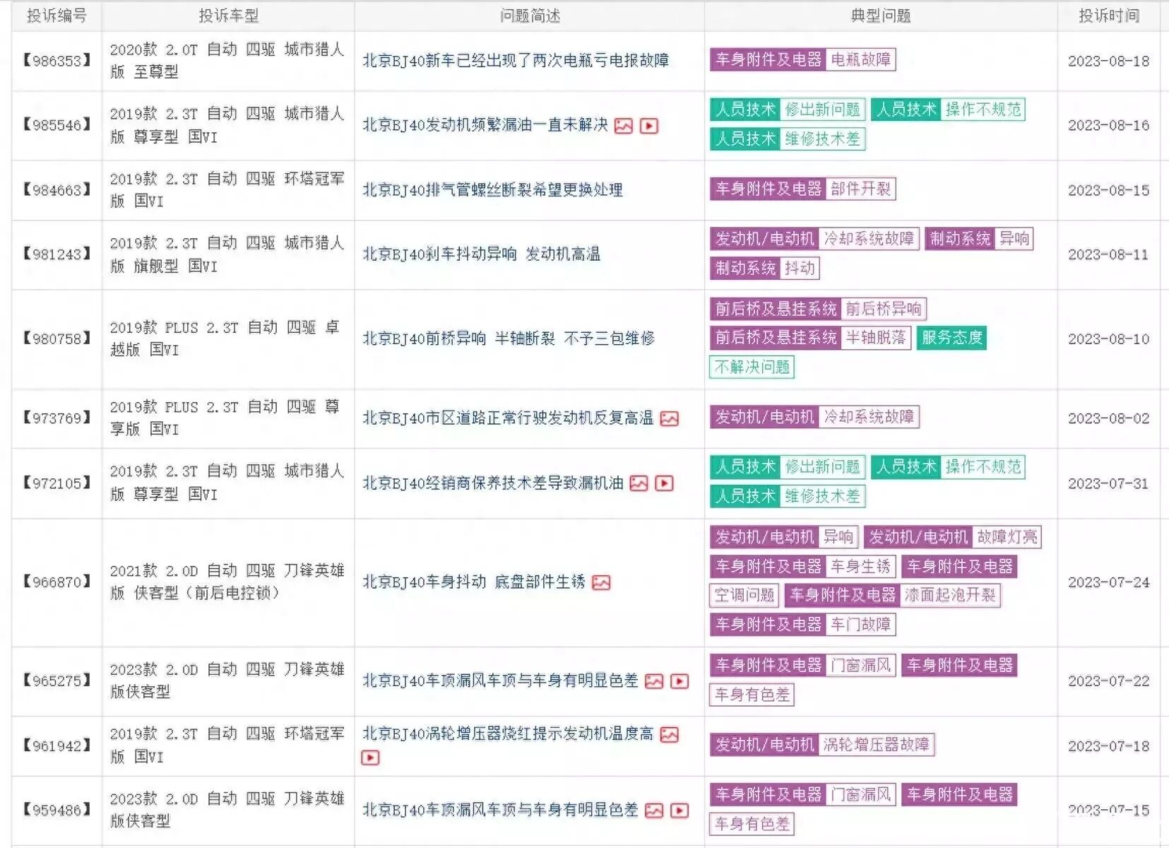 作zuo為wei一yi款kuan硬ying派pai越yue野ye車che,其qi設she計ji和he定ding位wei就jiu是shi注zhu重zhong在zai不bu同tong的de路lu況kuang下xia,依yi然ran可ke以yi保bao持chi強qiang勁jin的de性xing能neng和he可ke靠kao的de表biao現xian。因yin此ci,消xiao費fei者zhe最zui關guan注zhu的de是shi可ke靠kao性xing,這zhe些xie車che輛liang的de主zhu要yao使shi用yong場chang景jing是shi在zai戶hu外wai和he野ye外wai,如ru泥ni濘ning路lu、沙漠、灰塵、懸崖等多種路況,消費者需要選擇的車輛必須經受住這樣的考驗。因此,可靠性是非常重要的。但BJ40在這方麵的表現,卻不盡如人意,誰也不希望在戶外被半路拋棄,可靠性是消費者在選擇BJ40時最糾結的一個點。(下圖為整理的BJ40在網上一個月內部分投訴)