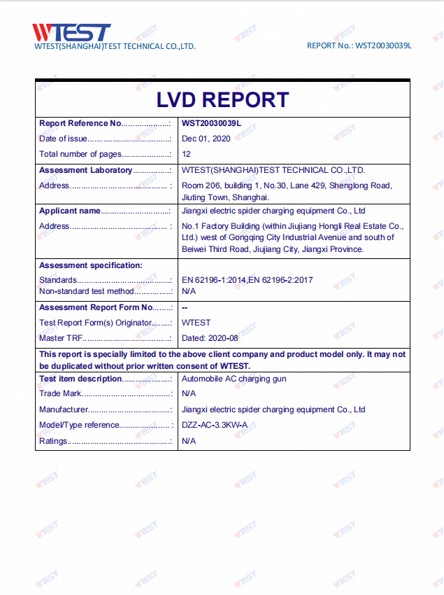 DIANZHIZNU 歐洲歐標CE檢測報告新能源汽車充電器充電槍