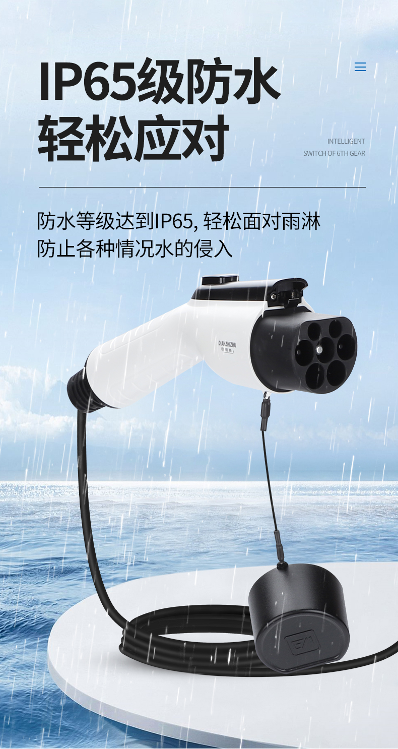 電蜘蛛汽車充電槍,槍頭采用PC阻燃材料,防燃防爆,槍體采一體式成型,無拚結,更防水,防雨,防水雨等級達IP67級,配鋁合金按鍵,
