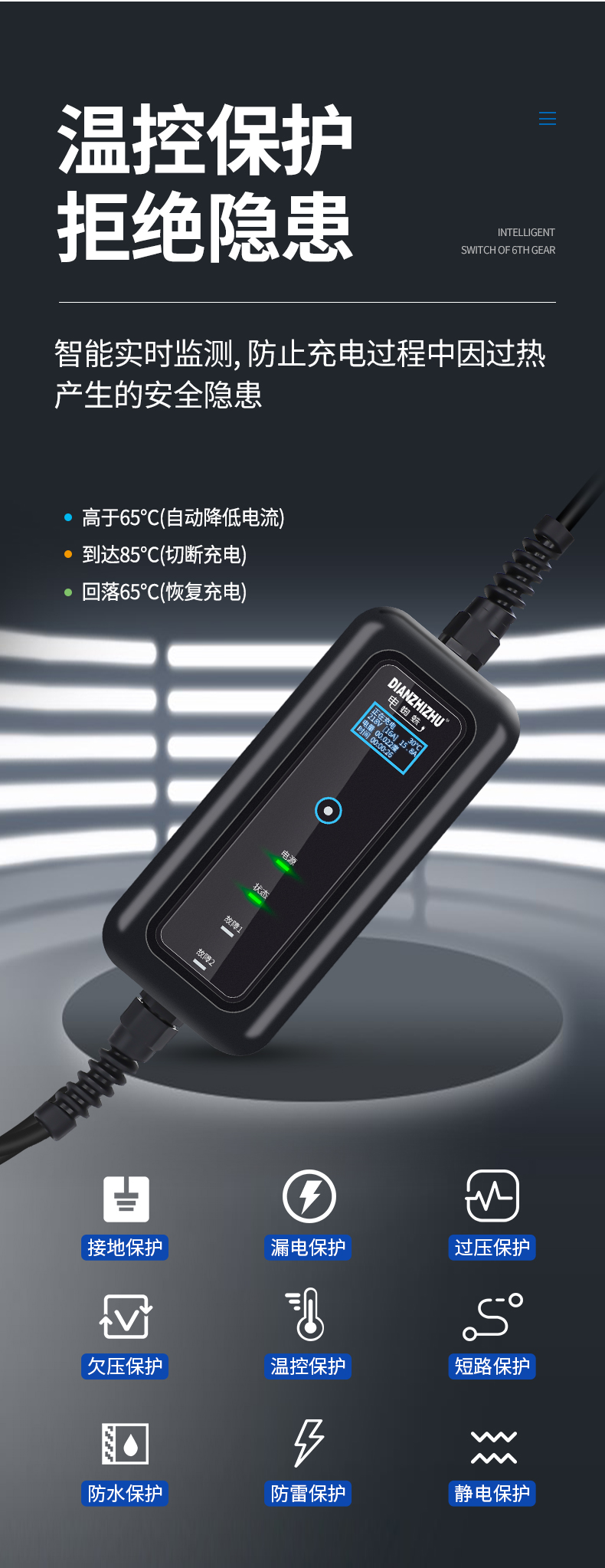 雙溫控保護充電更安全,免接地不用地線也能照樣充電,漏電保護,有漏電保護充電更安全。控製盒拱型設計,抗壓性更好